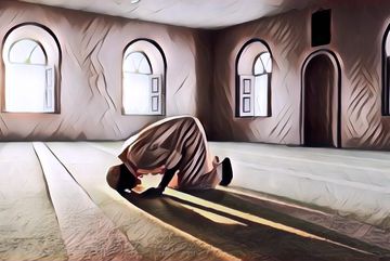 Seorang pria berpakaian rapi sholat di masjid tapi dengan gerakan ...