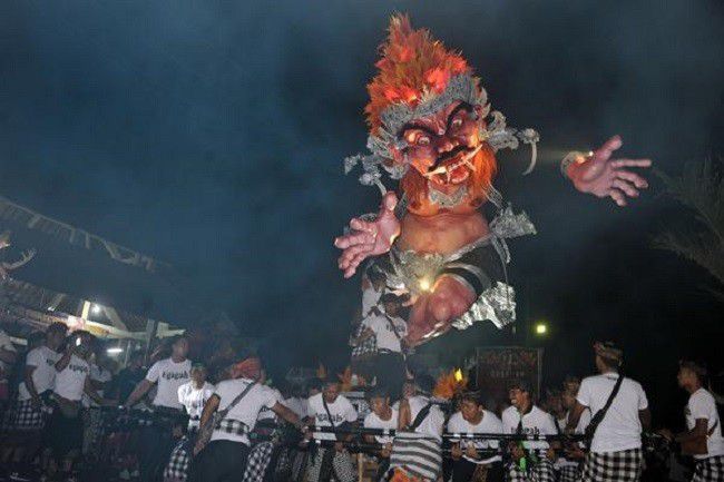 Pada tingkat desa, biasanya diadakan pawai ogoh-ogoh sebagai perwujudan dari Bhuta Kala yang bersifat negatif. Setelah diarak keliling desa, ogoh-ogih dibakar. Hal ini bertujuan agar hal-hal berbau negatif lenyap dan tidak mengganggu kehidupan manusia lagi.