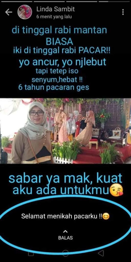 Dan yang tidak diingikan terjadi. Tanggal 26 Oktober 2018 mas pacar sudah di atas pelaminan bersama perempuan lain. Linda cuma bisa menangis. Tetapi tidak untuk waktu yang lama, ia tegar hingga berani berfoto dengan mempelai tanpa harus termehek-mehek seperti drama setingan.