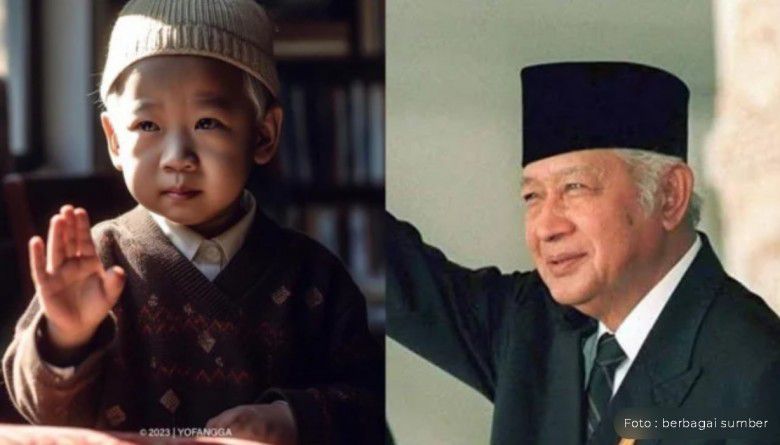 2. Sementara Presiden RI kedua, Soeharto, potret masa kecilnya digambarkan dengan seorang anak menggunakan kopiyah, mukanya polos dengan tangan kanan terangkat seperti gestur Soeharto dewasa ketika menyapa rakyatnya.
