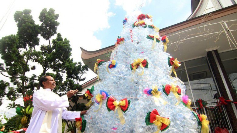 7. Pohon natal di Gereja Gembala Baik Pontianak ini tak kalah unik dan inspiratif. Mereka menggunakan kembali sampah gelas Aqua untuk membuat pohon Natal. Keren!