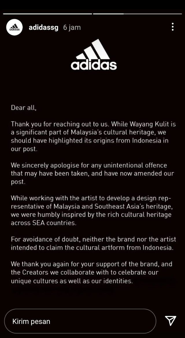 Adidas Singapura akhirnya mengungkapkan permintaan maaf setelah menyebut wayang kulit berasal dari Malaysia.
