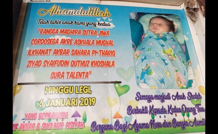Masih ingat sosok anak asal Tuban, Jawa Timur yang memiliki 19 suku kata untuk nama panjangnya? Bocah bernama lengkap Rangga Madhipa Sutra Jiwa Cordosega Akre Askhala Mughal Ilkhanat Akbar Sahara Pi - Thariq Ziyad Syaifudin Quthuz Khoshala Sura Talenta sulit mendapatkan akta lahir .
