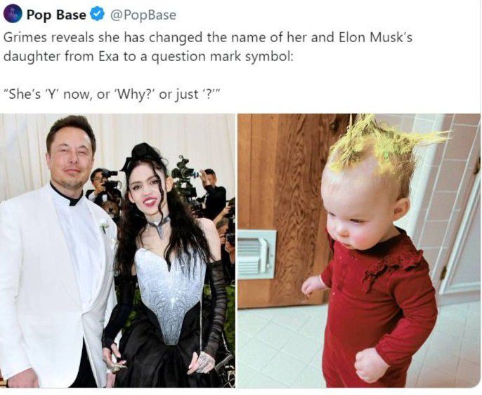 Grimes mengunggah foto anaknya beberapa waktu lalu dengan pakaian berwarna merah serta rambut hijau neonnya. Di postingan itu, ia menuliskan Y C dengan emoji naga di tengahnya. Para netizen pun menduga bila musisi ini mengubah nama anaknya menjadi huruf Y.