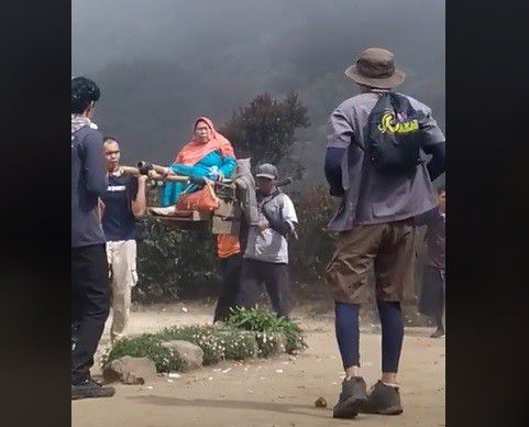 Dilansir dari akun TikTok @makk_abdul9277 nampak Mbok Yem tiba di warung dengan menggunakan tandu. Mbok Yem yang memakai baju warna biru dan kerudung warna krem, didampingi oleh 4 orang laki-laki. Tiga orang menggotong tandu Mbok Yem, satu orang khusus membawa barang pribadi Mbok Yem.