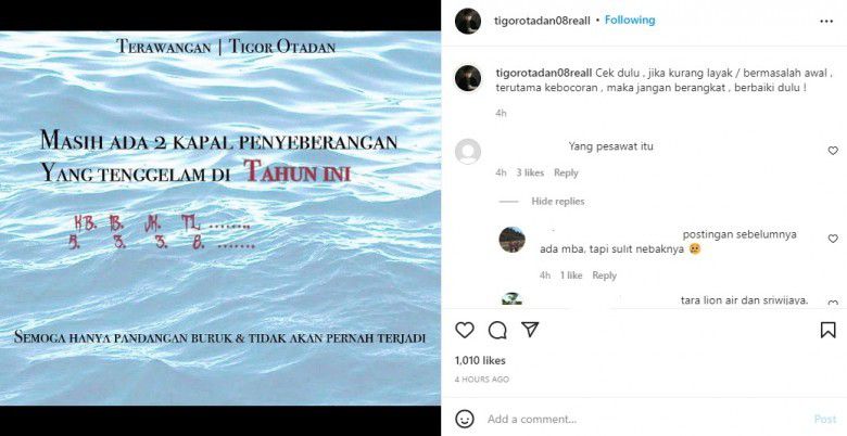 “Masih ada 2 kapal penyeberangan yang tenggelam di tahun ini. HB. 5. IB. 3. JK. 3. TL. 8. Semoga hanya pandangan buruk & tidak akan pernah terjadi,” begitu kata-kata yang ditulis Tigor Otadan dalam unggahannya.
