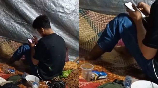Seorang pemudasedang santai bermain HP sambil menjaga kuburan yang masih baru (bali.suara.com)