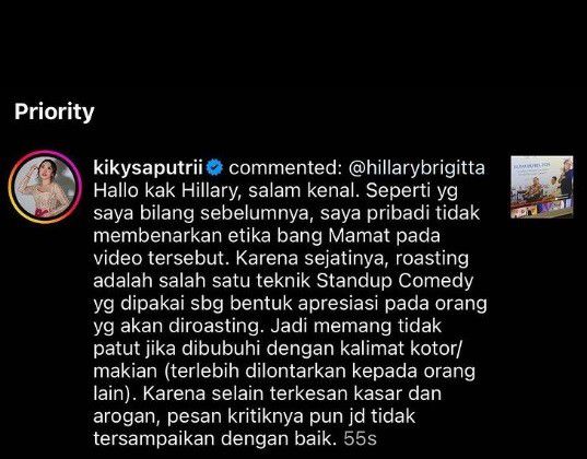 “Seperti yang saya bilang sebelumnya, saya pribadi tidak membenarkan etika bang Mamat pada video tersebut. Karena sejatinya roasting adalah salah satu teknik Standup Comedy yang dipakai sbg bentuk apresiasi pada orang yang akan diroasting,” tulis Kiki dilansir dari akun Instagram @hillarrybrigitta.