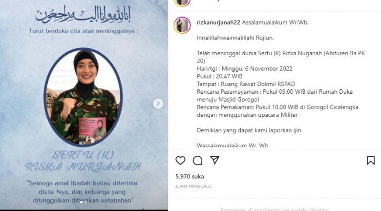 Dilansir dari Instagram @rizkanurjanah22, kabar duka tersebut diunggah oleh admin akun tersebut. “Assalamualaikum Wr.Wb. Innalillahiwainnalillahi Rojiun. Telah meninggal dunia Sertu (K) Rizka Nurjanah (Abituren Ba PK 20). Hari/tgl : Minggu, 6 November 2022Pukul : 20.47 WIB. Tempat : Ruang Rawat Dokmil RSPAD,” tulis kabar duka itu.