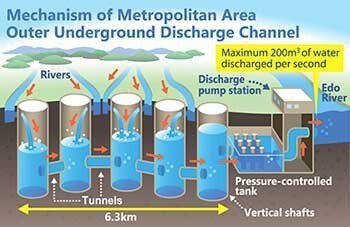 Lima tangki air raksasa terkubur di bawah tanah kota metropolis di Jepang. Tangki berbentuk silinder itu memiliki ukuran 70 meter atau setara luar parkir pesawat ulak-alik. Kelima tangki ini terhubung oleh gorong-gorong atau saluran air raksasa sepanjang 6,3 Km.