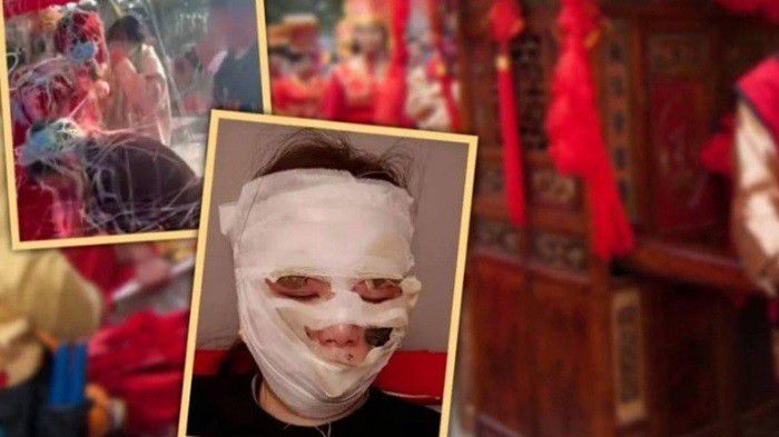 Terlihat pula luka bakar kehitaman di pipi wanita yang diketahui berasal dari Taizhou, provinsi Zheijang, China itu. "Aku hampir jadi pengantin yang cacat. Spray (streamer) yang menyebabkan wajahku terbakar," tulis wanita itu di unggahannya.