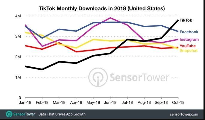Dalam pantauan sensortower.com pada bulan Oktober 2018. Dari 4 aplikasi yakni facebook, instagram, youtube dan snapchat, Tiktok berhasil berada di urutan pertama. Grafik pemasangan aplikasi ini naik dalam pengunduhan yang cukup banyak.