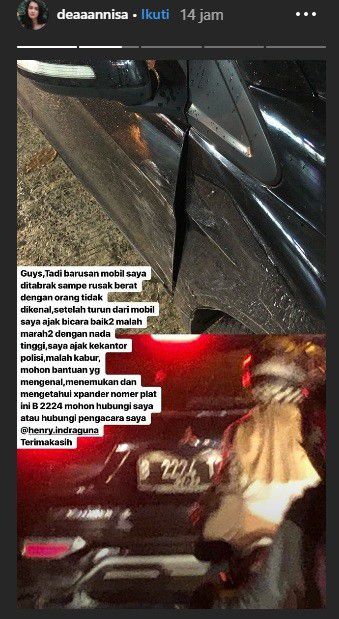 Hal tersebut, membuat Dhea Imut sedikit geram dengan si penabrak. Dalam keterangan yang sama di postingan Instagram Storiesnya, Dhea pun meminta bantuan kepada warganet untuk menemukan mobil yang telah menabraknya.