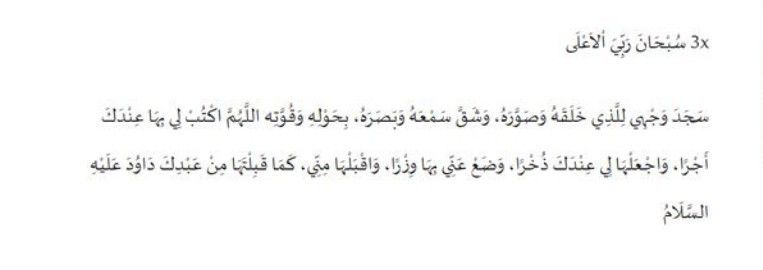 "Maha Suci Allah Yang Maha Tinggi. Wajahku bersujud kepada Zat yang menciptakan dan membentuknya dan Zat yang membentuk (membelah) pendengaran dan penglihatannya, dengan daya dan kekuatanNya. Ya Allah, tetapkanlah pahala untukku di sisi-Mu dengan sujud ini, jadikanlah sujud ini sebagai tabunganku di sisi-Mu, gugurkanlah dosa-dosaku melalui sujud ini, terimalah sujud ini dariku sebagaimana Engkau menerimanya dari hamba-Mu Nabi Daud 'alaihissalam."