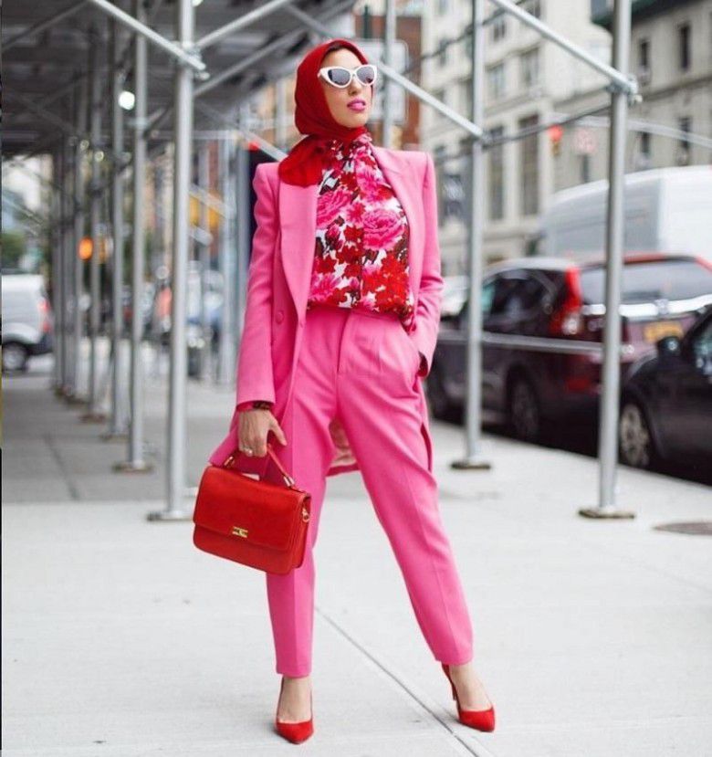 Bagi kamu yang berjiwa pemberani dan suka jadi pusat perhatian, padankan baju setelan pink seperti ini dengan jilbab warna merah. Pilih juga warna yang sama untuk blouse, tas, dan sepatu, agar semakin sempurna!