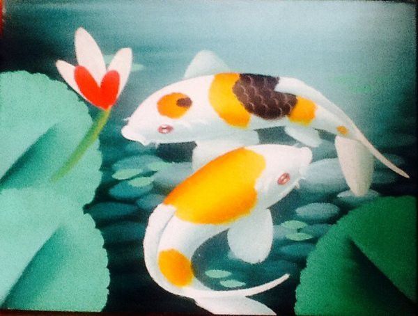 Lukisan dua ikan koi memiliki arti hubungan cinta yang dipenuhi dengan kebahagiaan dan keberuntungan. Tempatkan lukisan ikan koi ini di sektor barat daya rumah atau ruang tamu.