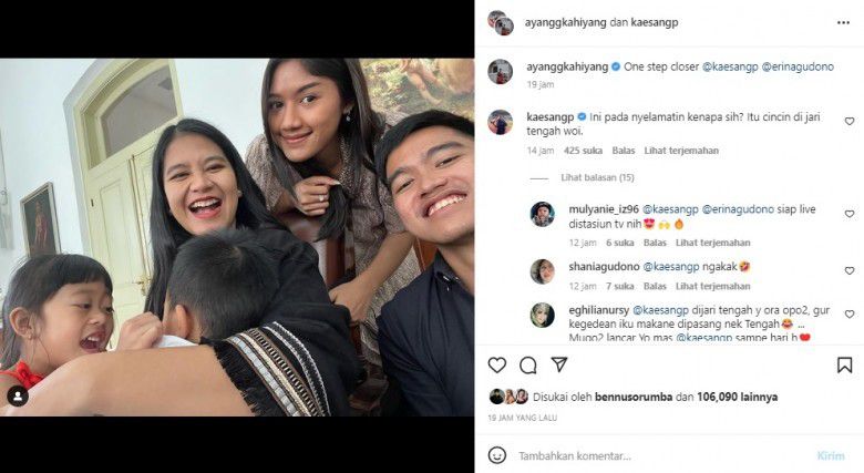 Kaesang Pangarep ramai disebut sudah melamar kekasihnya, Erina Gudono . Dugaan ini pertama kali muncul setelah kakak Kaesang, Kahiyang Ayu membagikan foto kebersamaan dengan pasangan kekasih itu sambil menuliskan kata ‘One Step Closer’.