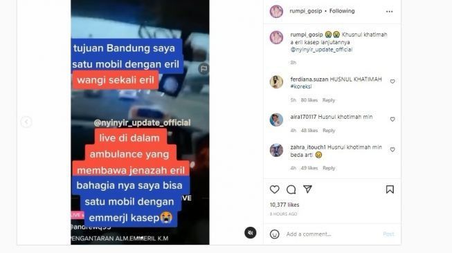 Postingan akun gosip itu pun langsung viral dan menuai banyak respon dari warganet. Banyak dari mereka yang ikut mendoakan Eril agar husnul khatimah.