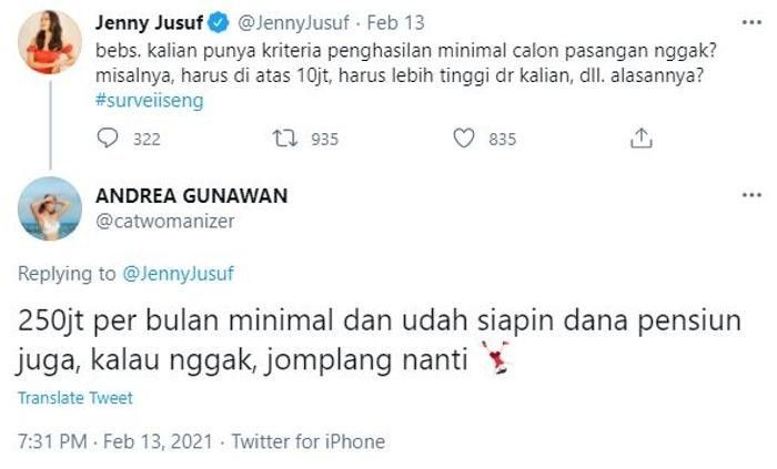 “Bebs, kalian punya kriteria penghasilan minimal calon pasangan nggak? Misalnya harus di atas 10jt, harus lebih tinggi dr kalian, dll. alasannya?,” tanya akun @JennyJusuf.