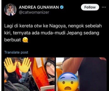 Dalam cuitan di akun X @catwomanizer, wanita cantik itu menceritakan momen tersebut. “Lagi di kereta otw ke Nagoya, nengok sebelah kiri, ternyata ada muda-mudi Jepang sedang berbuat,”cuitnya. Namun postingan tersebut kini sudah dihapus karena mendapatkan komentar negatif dari netizen.