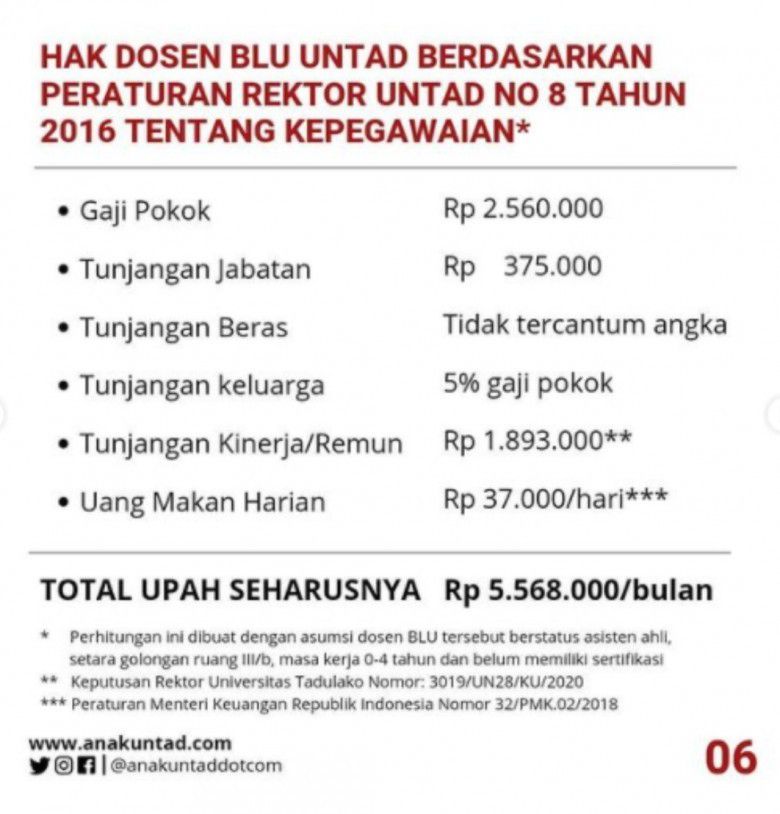 Menurut aturan, para dosen BLU seharusnya memiliki gaji pokok, tunjangan, hingga uang makan sekitar Rp5.568.000 sebulan. Kendati demikian, hal tersebut dikabarkan tidak dilakukan oleh Universitas Tadulako. Rata-rata dosen malah mendapat upah per bulan jauh dari kata layak dan lebih kecil dari gaji petugas parkir kampus.