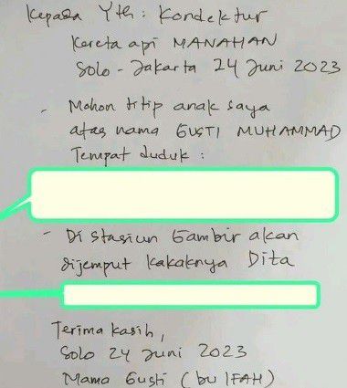 Gusti seorang anak berusia 12 tahun naik kereta api sendirian. Gusti menjadi penumpang kereta api Manahan dari Solo menuju Jakarta pada 24 Juni 2023 silam. Dia tidak didampingi oleh orangtua atau keluarganya. Namun ibu Gusti menulis sepucuk surat berisi pesan penting.