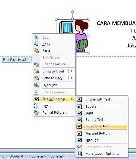 Atur logo agar nggak berantakan. Caranya klik logo terus pilih menu Format. Kalo udah, pilih Wrap Text terus pilih In Front of Text. Bisa juga dengan klik kanan ---> Text Wrapping ---> In Front of Text.