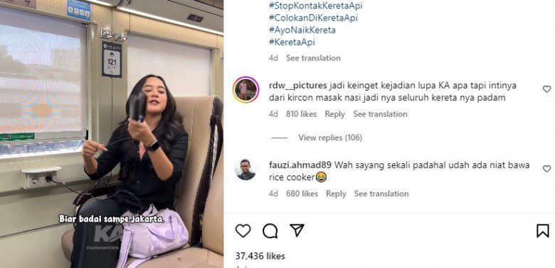 Beberapa waktu lalu akun Instagram PT KAI @kai121_ memberikan imbauan kepada masyarakat khususnya penumpang kereta api untuk bijak dalam penggunaan colokan listrik yang tersedia di dekat kursi penumpang. Sebab cerita penumpang yang masak nasi di kereta sempat membuat banyak pihak terkejut.