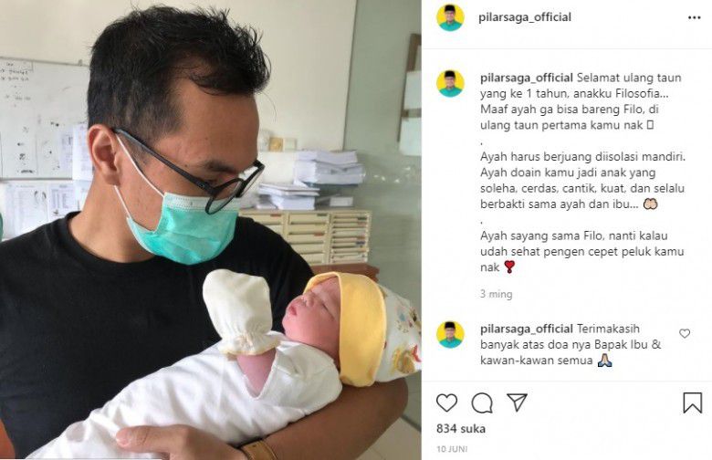 "Selamat ulang tahun yang ke 1 tahun, anakku Filosofia,, Maaf ayah ga bisa bareng Filo, di ulang tahun pertama kamu nak, ayah harus berjuang diisolasi mandiri," tulis Pilar.