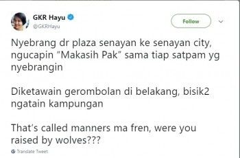 "Nyebrang dr plaza senayan ke senayan city, ngucapin "makasih pak"sama tiap satpam yang nyebrangin. Diketawain gerombolan di belakang, bisik2 ngatain kampungan. That's calles manners ma fren, were you raised by wolves???, tulis GKR Hayu.