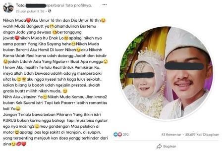 Unggahan itu juga disertai dua buah foto tangkapan layar sebuah akun Facebook. Salah satunya berisi cerita pasangan muda-mudi yang memutuskan untuk menikah muda.