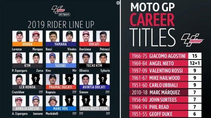 Dilansir dari situs Today.line.me, Akhirnya, list daftar formasi pembalap MotoGP sudah muncul. Federasi Motor Internasional (FIM) resmi merilis daftar susunan pembalap pada tahun 2019 yang tinggal sebentar lagi.