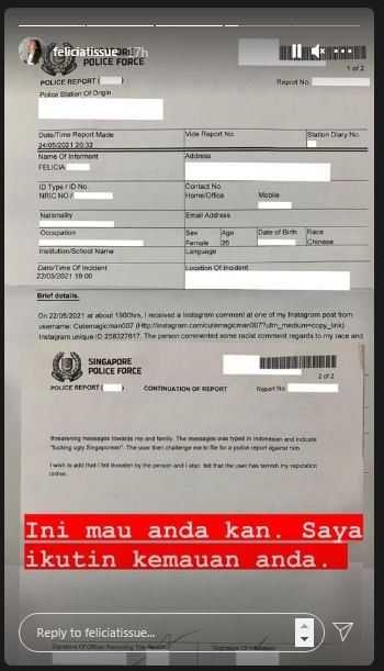 "Ini mau Anda kan. Saya ikutin kemauan anda," tulis Felicia sambil menyematkan foto bukti laporan ke Kepolisian Singapura.