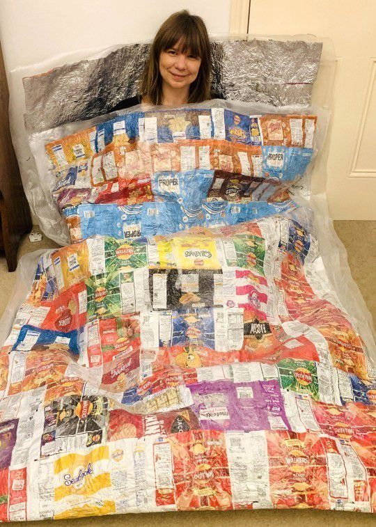 Nah, daur ulang plastik kemasan snack ini pun dilakukan oleh seorang perempuan asal Inggris. Perempuan ini bernama Pen Huston yang melakukan daur ulang plastik kemasan snack jadi kantong tidur gengs!