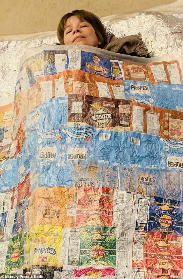 Perempuan berusia 45 tahun ini kemudian mengumpulkan bungkus keripik sebanyak mungkin. Pen Huston kemudian melakukan daur ulang plastik hingga jadilah kantong tidur yang berguna untuk menghangatkan badan.