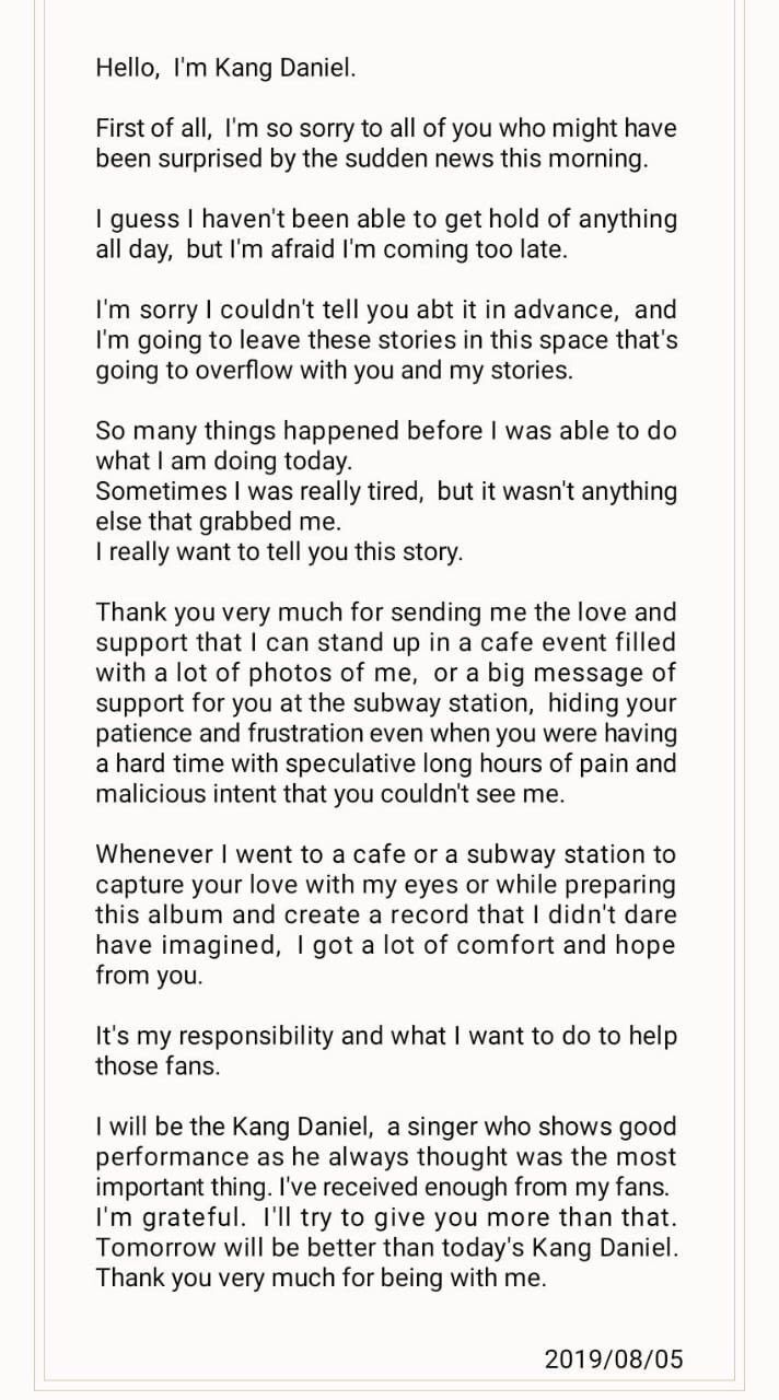 Surat dari Kang Daniel untuk para penggemar (Allkpop.com)