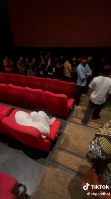 Namun saat lampu bioskop dinyalakan, tampak seorang penonton sedang duduk dalam keadaan kepala terkulai di bangku bioskop.