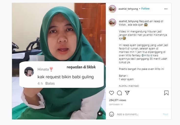 Seperti wanita satu ini, melalui video yang dibagikan oleh akun Instagram @asahid_tehyung, ia diminta oleh seorang warganet untuk membuatkan video tutorial cara memasak babi guling.