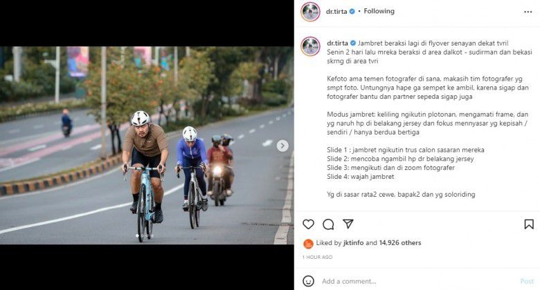 “Modus jambret: keliling ngikutin plotonan, mengamati frame, dan yg naruh hp di belakang jersey dan fokus mennyasar yg kepisah / sendiri / hanya berdua bertiga,” ungkap dr. Tirta.