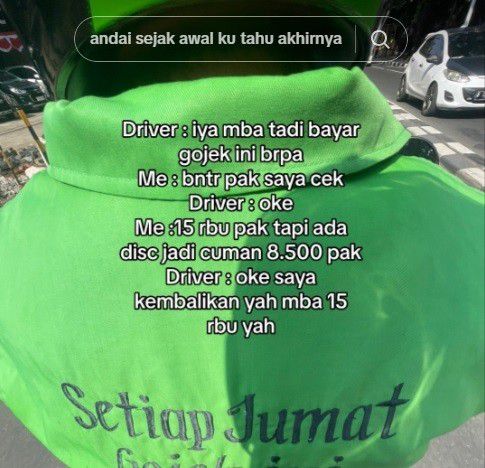 Si penumpang ojek online ini membayar ongkosnya menggunakan aplikasi online atau cashless. Maryono bertanya kepada penumpang soal jumlah ongkos yang dia bayarkan. Ternyata ongkos Rp 15 ribu namun karena ada discount, si penumpang hanya bayar Rp 8.500. Namun Maryono memutuskan untuk mengembalikan Rp 15 ribu dari penumpang.