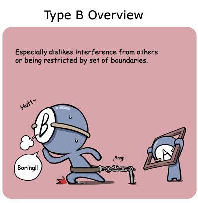 B juga dikenal sebagai orang yang sulit dikekang. Hal itu pula yang terkadang membuat orang-orang kecewa terhadapnya. Mereka cenderung ingin melakukan apapun tanpa mempertimbangkan perasaan atau pikiran orang lain.