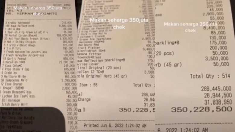 Di akhir, dia menunjukkan total dari semua makanan serta minuman berjumlah 514 pieces yang dipesannya mencapai Rp350 juta. Harga ini tentunya membuat sejumlah netizen kaget. Banyak dari mereka yang merasa uang tersebut bisa digunakan untuk hal yang lebih bermanfaat.