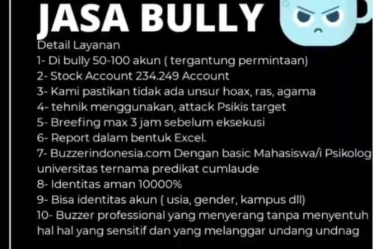“Stok akun 234.249. Kami pastikan tidak ada unsur hoax, ras, agama. Briefing maksimal 3 jam sebelum eksekusi. Laporan dalam bentuk Excel,” tulis keterangan jasa bully di iklan tersebut.