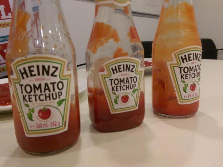 Kalo saos tomat atau sambal yang tersisa dalam botol kaca tinggal sedikit, balik aja gengs botolnya lalu guncangkan dalam posisi terbalik. Isi botol kaca itu akan berpindah dari posisi dasar ke bagian leher botol.