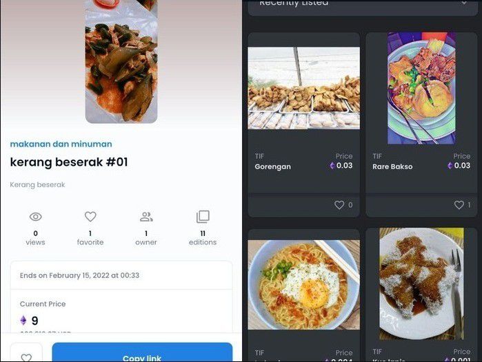 Begitu pun ketika detikFood mencari penjual gambar makanan di NFT melalui pencarian Google. Hasilnya, mereka menemukan akun bernama Fitriani01 yang menjual gambar cirambay dengan harga sekitar 5 Ethereum atau sekitar Rp 237 juta.