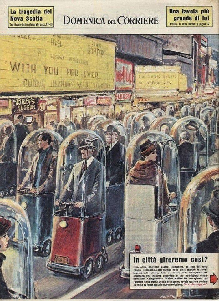 lustrasi karya Walter Molino ini diberi tulisan "Akankah kita berkeliling kota seperti ini?" diterbitkan di surat kabar Italia La Domenica del Corriere pada 16 Desember 1962.