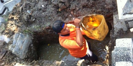 Petugas makam langsung mengeluarkan air setinggi sekitar 30 sentimeter keluar dari makam agar bisa digunakan sebagai tempat peristirahatan terakhir Freddy Budiman si Gembong Narkoba . Kemungkinan air tersebut muncul karena hujan deras sebelum proses pemakaman berlangsung.