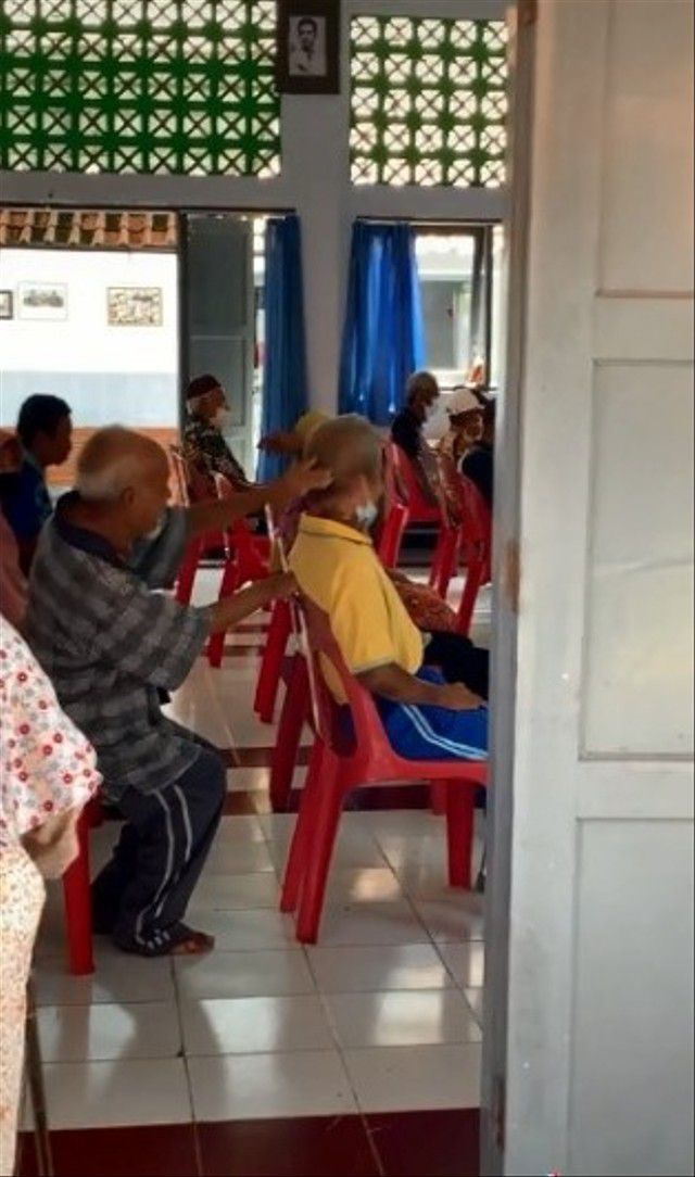 Dalam video tersebut, tampak momen di mana mereka sedang mengantre, lalu kakek berbaju kotak-kotak menjaili sahabatnya dengan mengusap kepala kakek berbaju kuning.