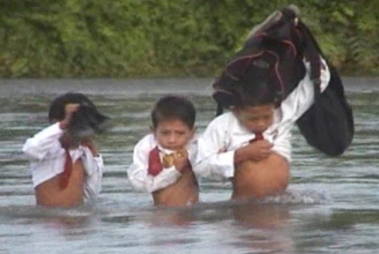 Sang guru teladan ini nekat menerjang ombak sambil mengangkat tas agar tidak terkena air laut. Emang luar biasa sekali ya pak Muhammad ini ....