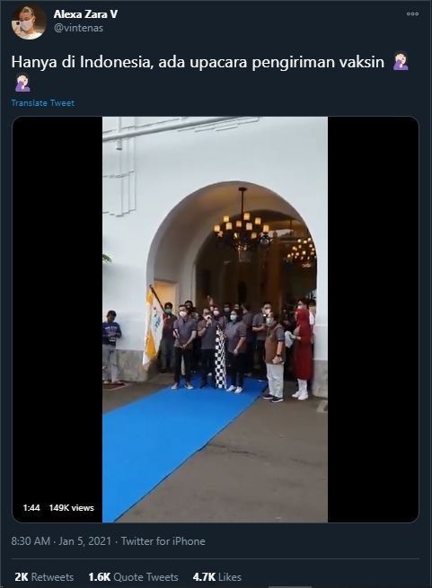 "Hanya di Indonesia ada upacara pengiriman vaksin," ujarnya disertai emoji tepuk jidat.